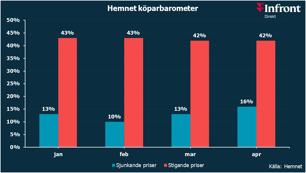 Bland besökarna på Hemnet som planerar att köpa bostad räknar nu 42 procent med stigande priser de närmaste sex månaderna, oförändrat från förra månaden. Samtidigt tror 16 procent på sjunkande priser, jämfört med 13 procent föregående månad.