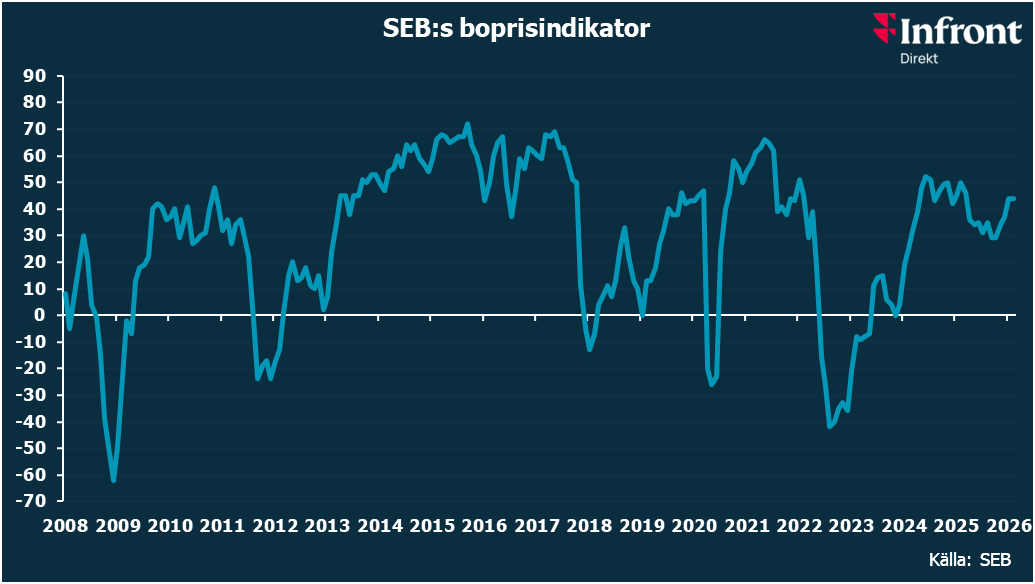 "Trots en turbulent inledning av året behåller hushållen sin positiva syn på bostadsmarknaden. Drivkrafter som räntestabilitet, skattesänkningar och bättre konjunkturutsikter ser ut att väga tyngre än kortsiktig geopolitisk osäkerhet. Det talar för att optimismen stärks under våren, vilket stegvis bör återspeglas i den faktiska bostadsprisutvecklingen", säger SEB:s privatekonom Américo Fernández.