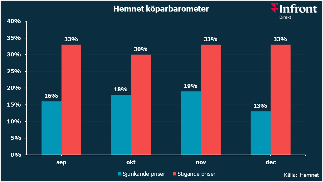Bland besökarna på Hemnet som planerar att köpa bostad räknar nu 33 procent med stigande priser de närmaste sex månaderna, jämfört med 33 procent förra månaden. Samtidigt tror 13 procent på sjunkande priser, jämfört med 19 procent föregående månad.