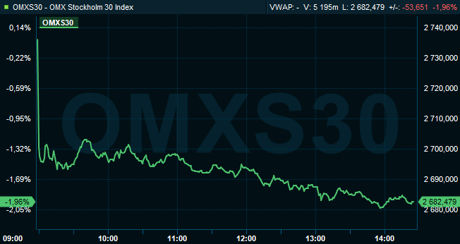Omkring klockan 14.20 hade OMXS30 sjunkit 2,0 procent till 2.682 och aktier för 7,7 miljarder kronor var då omsatta på Stockholmsbörsen i sin helhet.