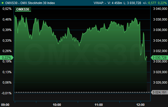Omkring klockan 12.10 var storbolagsindexet upp 0,2 procent till 3.031 och aktier för hade 7,3 miljarder omsatts på Stockholmsbörsen. Ute på de ledande Europabörserna sjönk index i Frankfurt 0,1 procent, medan Londonbörsen och Paris såg en uppgång på 0,5 respektive 0,1 procent.