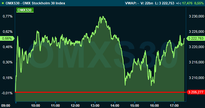 Vid stängning hade storbolagsindexet OMXS30 stigit 0,6 procent till 3.222 och aktier för 35 miljarder kronor omsattes på Stockholmsbörsen. Under februari steg OMXS30 strax över 7 procent.