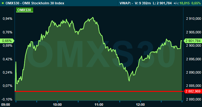 Vid stängning klockan 13 hade storbolagsindexet OMXS30 stigit 0,7 procent till 2.902. Aktier för 11,7 miljarder kronor hade då omsatts på Stockholmsbörsen i sin helhet.