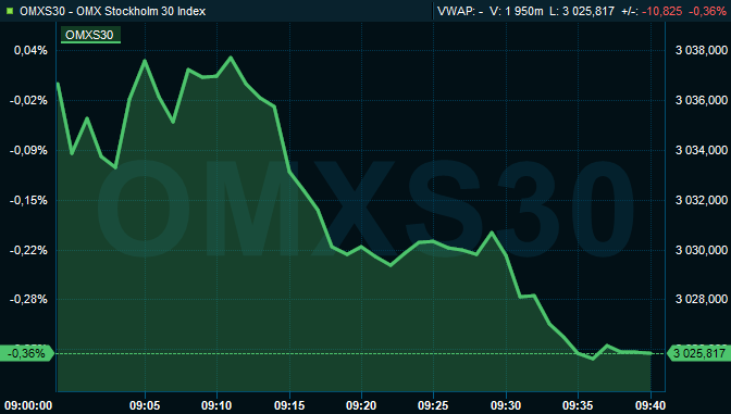 Runt klockan 09.40 hade det svenska storbolagsindexet OMXS30 sjunkit 0,4 procent till nivån 3.026, efter torsdagens rejäla uppställ. Aktier för 2,7 miljarder kronor omsattes i den inledande handeln på Stockholmsbörsen i sin helhet.