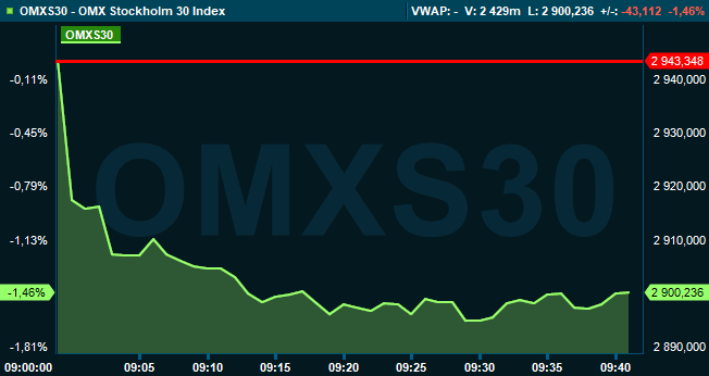 Vid klockan 9.40 sjönk storbolagsindexet OMXS30 med 1,5 procent till nivån 2.900. Aktier för omkring 3,2 miljarder kronor hade då omsatts på Stockholmsbörsen i sin helhet.