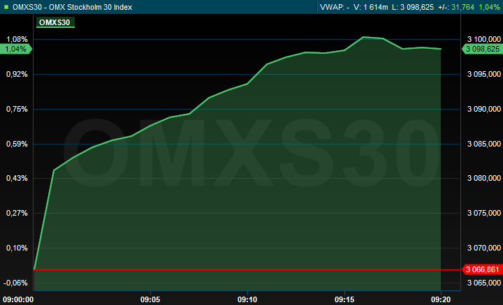 Omkring klockan 9.20 hade OMXS30 stigit 1,0 procent till 3.099. Aktier för 2,2 miljarder kronor var då omsatta på Stockholmsbörsen.
