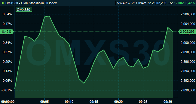 Klockan 9.30 var storbolagsindexet OMXS30 upp 0,4 procent till nivån 2.902. Aktier för omkring 1,7 miljarder konor hade då omsatts på Stockholmsbörsen i sin helhet.