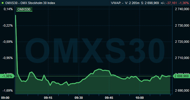 Vid cirka klockan 10.15 hade OMXS30 fallit med 1,4 procent till 2.699. Aktier för drygt 3 miljarder hade då omsatts på Stockholmsbörsen i sin helhet. Ute på de ledande Europabörserna syntes nedgångar på omkring 1 procent i både Frankfurt, London och Paris.