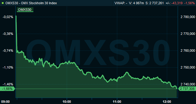 Vid 12.15-tiden hade OMXS30 sjunkit 1,6 procent till 2.737. Aktier för 6 miljarder kronor var då omsatta på Stockholmsbörsen i sin helhet. Ute på de ledande Europabörserna sjönk index med mellan 1-1,5 procent.