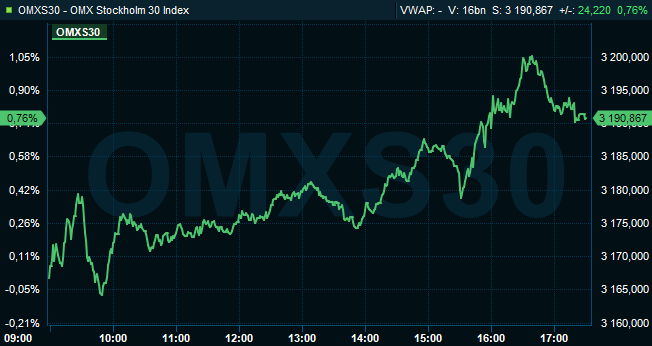 Vid stängning hade storbolagsindexet OMXS30 stigit 0,8 procent till 3.191 och aktier för 24 miljarder kronor omsattes på Stockholmsbörsen.