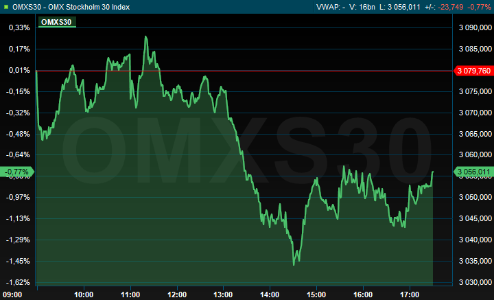 Vid stängning hade storbolagsindexet OMXS30 sjunkit 0,8 procent till 3.056. Då hade aktier för 27 miljarder kronor omsatts på Stockholmsbörsen i sin helhet.