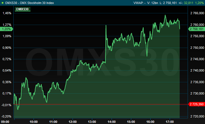 Vid stängning hade OMXS30 stigit 1,2 procent till 2.758. Aktier för 18 miljarder kronor hade då omsatts på Stockholmsbörsen. Ute i Europa var huvudindex i Paris och Frankfurt båda upp omkring 1 procent.
