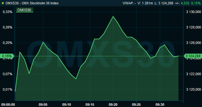 Storbolagsindex OMXS30 var runt 09.30-tiden upp 0,2 procent till nivån 3.126 medan breda OMXSPI var upp 0,1 procent. Då hade aktier för cirka 2 miljarder omsatts på Stockholmsbörsen.