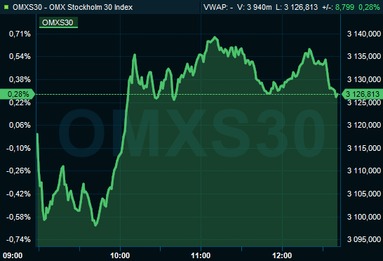 Vid 12.40-tiden var storbolagsindexet OMXS30 upp 0,3 procent till nivån 3.127 efter onsdagens indexuppgång på 1,1 procent. Aktieaffärer för 6,6 miljarder kronor hade då gjorts på Stockholmsbörsen.