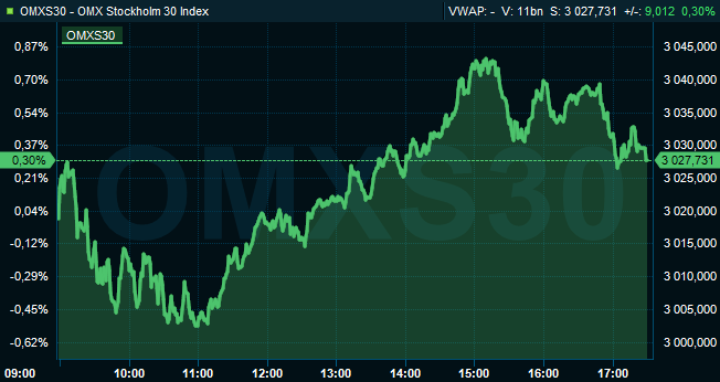 Vid börsens stängning var det svenska storbolagsindexet OMXS30 upp 0,3 procent till 3.028. Aktier för 17 miljarder kronor hade då omsatts på Stockholmsbörsen.
