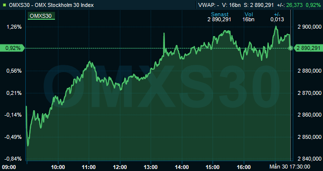STOCKHOLM (Nyhetsbyrån Direkt) Stockholmsbörsen handlades fortsatt på plus under eftermiddagen, och storbolagsindexet OMXS30 stängde upp 0,9 procent till nivån 2.890 på måndagen. Då hade aktier för 23 miljarder kronor omsatts på Stockholmsbörsen i sin helhet.