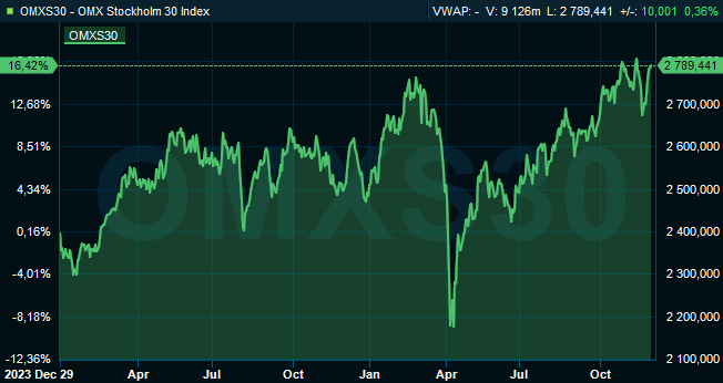 Vid stängning hade storbolagsindexet OMXS30 stigit 0,5 procent till 2.789. Aktier för omkring 15 miljarder kronor var då omsatta på Stockholmsbörsen i sin helhet.