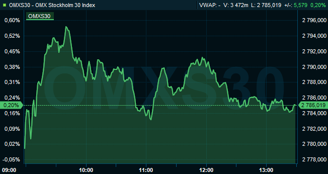 Klockan 13.30 hade det svenska storbolagsindexet OMXS30 stigit 0,2 procent till nivån 2.785. Aktieaffärer för knappt 6 miljarder kronor hade då gjorts.