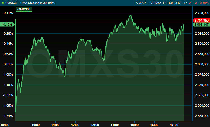 Vid stängning hade det svenska storbolagsindexet OMXS30 sjunkit 0,1 procent till nivån 2.699. Aktier värda 17 miljarder kronor hade då bytt ägare på Stockholmsbörsen.