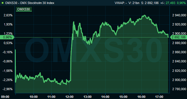 Vid börsens stängning var det svenska storbolagsindexet OMXS30 upp 1,0 procent till nivån 2.892. Då hade aktieaffärer för 31 miljarder kronor gjorts på börsen i sin helhet.