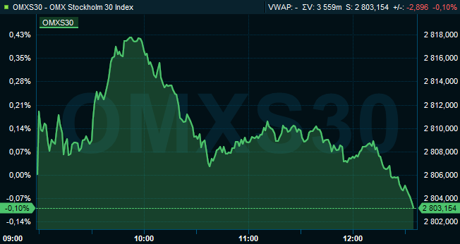 Omkring klockan 12.35 hade OMXS30 sjunkit 0,1 procent till 2.803. Aktier för 6,1 miljarder kronor hade då omsatts på Stockholmsbörsen i sin helhet. Ute på de ledande Europabörserna var rörelserna blandade med en uppgång på 0,5 procent för CAC 40-indexet i Paris medan DAX-indexet i Frankfurt var ned 0,7 procent.