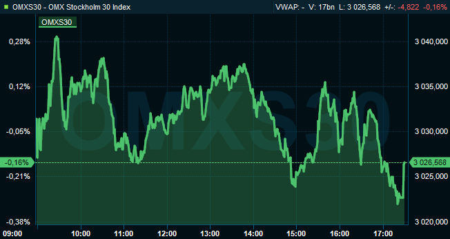 Vid stängning hade storbolagsindexet OMXS30 sjunkit med 0,2 procent till 3.027 och aktier för 26 miljarder kronor omsatts på Stockholmsbörsen.