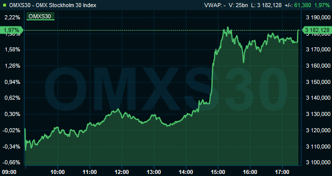 Storbolagsindexet OMXS30 steg 2,0 procent till 3.182. Aktier för höga 36 miljarder kronor bytte ägare på Stockholmsbörsen.