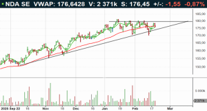 Nordea-aktien handlas i stigande trend och aktien är intressant inför test av motståndet vid 180 kronor. Bryter aktien upp, utlyses köpsignal och vidare uppgångar indikeras. Sker uppbrottet under tilltagande omsättning, förstärker det signalvärdet i kursrörelsen. I skrivande stund handlas aktien omkring neutrala kursnivåer till RSI 51, ovan både 50- (175kr) och 200-dagars (155kr) glidande medelvärden. Köp på eventuellt uppbrott föreslås inom affärsintervallet 180-181 kronor med målkurs 200 kronor på medellång sikt. Stop loss anges vid 174 kronor.