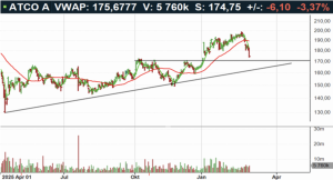 Atlas Copco-aktien handlas i positiv huvudtrend. Aktien är intressant ur ett tekniskt perspektiv på aktuell rekyl. En ingång omkring stödet vid 170 kronor ger en sund balans mellan risk och potentiell avkastning. I skrivande stund handlas aktien kring översålda kursnivåer till RSI 29, mellan 50- (185kr) och 200-dagars (164kr) glidande medelvärden. Köp föreslås inom affärsintervallet 170-171 kronor med målkurs 188 kronor på medellång sikt. Stop loss anges vid 165 kronor.
