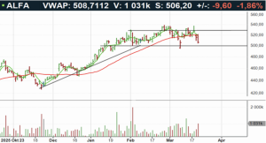 Alfa Laval-aktien handlas i stigande trend och aktien har den senaste tiden handlats inom konsolideringsintervallet 500-550 kronor. I skrivande stund handlas aktien mellan neutrala och översålda kursnivåer till RSI 42, mellan 50- (515kr) och 200-dagars (456kr) glidande medelvärden. En ingång omkring stödet vid 500 kronor ger en attraktiv balans mellan risk och potentiell avkastning. Köp på eventuell rekyl föreslås omkring stödet inom affärsintervallet 500-501 kronor med målkurs 552 kronor på medellång sikt. Stop loss anges vid 480 kronor.