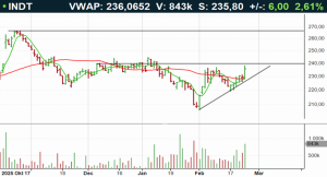 Indutrade-aktien handlas i stigande trend och aktien är intressant inför test av motståndet vid 240 kronor. Bryter aktien upp, utlyses köpsignal och vidare uppgångar indikeras. Sker uppbrottet under tilltagande omsättning, förstärker det signalvärdet i kursrörelsen. På uppsidan möter ett sekundärt motstånd upp omkring 270 kronor. I skrivande stund handlas aktien mellan neutrala och överköpta kursnivåer till RSI 59, mellan 50- (231kr) och 200-dagars (242kr) glidande medelvärden. Håll aktien under uppsikt och köp föreslås på eventuellt uppbrott. Köp föreslås inom affärsintervallet 240-241 kronor med målkurs 265 kronor på medellång sikt. Stop loss anges vid 232 kronor.