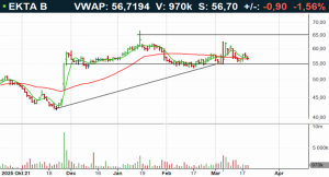 Elekta-aktien handlas i positiv huvudtrend. Aktien har den senaste tiden rört sig inom konsolideringsintervallet 55-65 kronor. En ingång omkring konsolideringsbotten vid 55 kronor ter sig attraktivt ur ett tekniskt perspektiv. I skrivande stund handlas aktien omkring neutrala kursnivåer till RSI 48, mellan 50- (58kr) och 200-dagars (51kr) glidande medelvärden. Köp omkring stödet föreslås inom affärsintervallet 55-56 kronor med målkurs 62 kronor på medellång sikt. Stop loss anges vid 54 kronor.