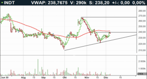 Indutrade-aktien handlas i stigande trend och aktien är intressant inför test av motståndet vid 240 kronor. Bryter aktien upp, utlyses köpsignal och vidare uppgångar indikeras. Sker uppbrottet under tilltagande omsättning, förstärker det signalvärdet i kursrörelsen. På uppsidan möter ett sekundärt motstånd upp omkring 270 kronor. I skrivande stund handlas aktien omkring neutrala kursnivåer till RSI 53, lägre än både 50- (238kr) och 200-dagars (254kr) glidande medelvärden. Köp på eventuellt uppbrott inom affärsintervallet 240-241 kronor med målkurs 265 kronor på medellång sikt. Stop loss anges vid 232 kronor.