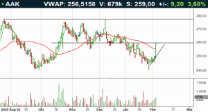 AAK-aktien är intressant inför test av motstånd vid 260 kronor. Bryter aktien upp, utlyses köpsignal och vidare uppgångar indikeras. Sker uppbrottet under tilltagande omsättning, förstärker det signalvärdet i kursrörelsen. På uppsidan möter ett sekundärt motstånd upp kring 278 kronor. I skrivande stund handlas aktien mellan neutrala och överköpta kursnivåer till RSI 59, ovan både 50- (258kr) och 200-dagars (258kr) glidande medelvärden. Köp på eventuellt uppbrott föreslås inom affärsintervallet 260-261 kronor med målkurs 288 kronor på medellång sikt. Stop loss anges vid 252 kronor.