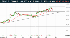Ericsson-aktien handlas i positiv huvudtrend. Aktien är intressant på rådande rekyl för en ingång omkring stödet vid 100 kronor för en bra risk/reward. I skrivande stund handlas aktien omkring neutrala kursnivåer till RSI 53, ovan både 50- (99kr) och 200-dagars (86kr) glidande medelvärden. Köp föreslås inom affärsintervallet 100-101 kronor med målkurs 112 kronor på medellång sikt. Stop loss anges vid 97 kronor.