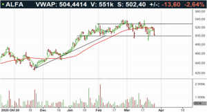 Alfa Laval-aktien handlas i positiv huvudtrend och aktien har den senaste tiden handlats inom konsolideringsintervallet 500-530 kronor. I skrivande stund handlas aktien mellan neutrala och översålda kursnivåer till RSI 42, mellan 50- (516kr) och 200-dagars (458kr) glidande medelvärden. En ingång omkring stödet vid 500 kronor ger en bra balans mellan risk och potentiell avkastning. Köp föreslås inom affärsintervallet 500-502 kronor med målkurs 555 kronor på medellång sikt. Stop loss anges vid 482 kronor.