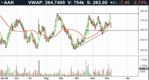 AAK-aktien handlas i en positiv huvudtrend. Aktien har sedan mitten av oktober rört sig inom konsolideringsintervallet 260-280 kronor. En ingång omkring stödet vid 260 kronor skapar en bra balans mellan risk och potentiell avkastning. I skrivande stund handlas aktien omkring neutrala kursnivåer till RSI 49, ovan både 50- (261kr) och 200-dagars (263kr) glidande medelvärden. Håll aktien under uppsikt och köp föreslås på eventuell rekyl omkring konsolideringsbotten. Köp föreslås inom affärsintervallet 260-261 kronor med målkurs 288 kronor på medellång sikt. Stop loss anges vid 252 kronor.