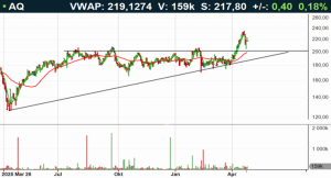 AQ Group-aktien handlas i stigande huvudtrend och det positiva sentimentet bekräftades nyligen då aktien bröt upp genom motståndet vid 200 kronor. Framgent agerar tidigare motståndet viktigt stöd, tillika attraktiv ingångsnivå i aktien. I skrivande stund handlas aktien mellan neutrala och överköpta kursnivåer till RSI 61, ovan både 50- (194kr) och 200-dagars (190kr) glidande medelvärden. Köp på eventuell vidare rekyl föreslås omkring stödet, inom affärsintervallet 200-201 kronor med målkurs 225 kronor på medellång sikt. Stop loss anges vid 194 kronor.