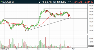 SAAB-aktien handlas i positiv huvudtrend. På uppsidan möter motstånd upp kring 750 kronor på nedsidan agerar 600 kronor stöd. En ingång omkring stödet ger en bra balans mellan risk och potentiell avkastning. I skrivande stund handlas aktien mellan neutrala och översålda kursnivåer till RSI 37, mellan 50- (668kr) och 200-dagars (557kr) glidande medelvärden. Köp omkring stödet föreslås inom affärsintervallet 600-602 kronor med målkurs 665 kronor på medellång sikt. Stop loss anges vid 580 kronor.