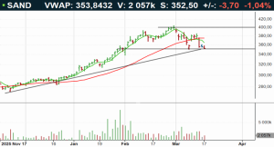 Sandvik-aktien handlas i stigande huvudtrend och aktien är intressant på rådande rekyl omkring stödet vid 350 kronor för en sund balans mellan risk och potentiell avkastning. I skrivande stund handlas aktien mellan mellan neutrala och översålda kursnivåer till RSI 40, mellan 50- (359kr) och 200-dagars (282kr) glidande medelvärden. På uppsidan möter motstånd upp kring 400 kronor. Köp föreslås omkring stödet inom affärsintervallet 350-351 kronor med målkurs 386 kronor på medellång sikt. Stop loss anges vid 340 kronor.