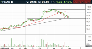 Peab-aktien handlas i stigande huvudtrend. Aktien har sedan årsskiftet rört sig inom konsolideringsintervallet 90-105 kronor. I skrivande stund handlas aktien mellan neutrala och översålda kursnivåer till RSI 39, mellan 50- (98kr) och 200-dagars (83kr) glidande medelvärden. En ingång omkring stödet vid konsolideringsbotten ter sig attraktivt ur ett tekniskt perspektiv. Köp föreslås inom affärsintervallet 90-91 kronor med målkurs 100 kronor på medellång sikt. Stop loss anges vid 87,50 kronor.