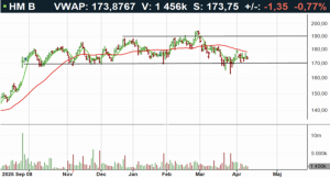 H&M-aktien har sedan i höstas handlats inom konsolideringsintervallet 170-190 kronor. En ingång omkring konsolideringsbotten vid 170 kronor ter sig attraktivt ur ett tekniskt perspektiv. I skrivande stund handlas aktien omkring neutrala kursnivåer till RSI 46, mellan 50- (166kr) och 200-dagars (180kr) glidande medelvärden. Köp på eventuell rekyl föreslås inom affärsintervallet 170-171 kronor med målkurs 188 kronor på medellång sikt. Stop loss anges vid 165 kronor.