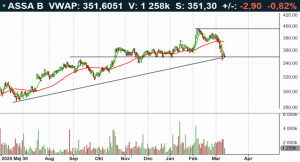 Assa Abloy-aktien handlas i en underliggande stigande trend och är intressant ur ett tekniskt perspektiv på senaste tidens rekyl omkring stödet vid 350 kronor. På uppsidan möter motstånd upp kring 400 kronor. I skrivande stund handlas aktien omkring översålda kursnivåer till RSI 34, mellan 50- (370kr) och 200-dagars (341kr) glidande medelvärden. Köp föreslås inom affärsintervallet 350-351 kronor med målkurs 388 kronor på medellång sikt. Stop loss anges vid 338 kronor.