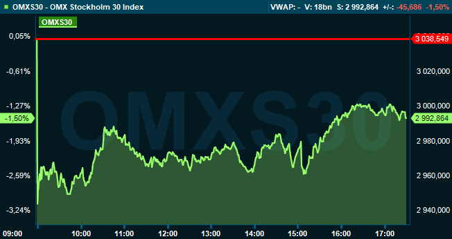 Vid stängning hade storbolagsindexet OMXS30 ned 1,5 procent till nivån 2.993. Aktier för omkring 27 miljarder konor var då omsatta på Stockholmsbörsen i sin helhet.