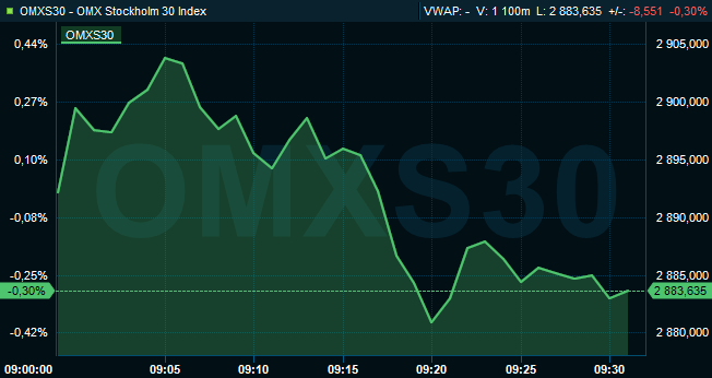 Efter måndagens svenska börsåterhämtning på 1 procent var det svenska storbolagsindexet OMXS30 vid 9.30-tiden på tisdagen ned 0,3 procent till nivån 2.884. Aktier för 1,7 miljarder kronor hade då bytt ägare på Stockholmsbörsen.