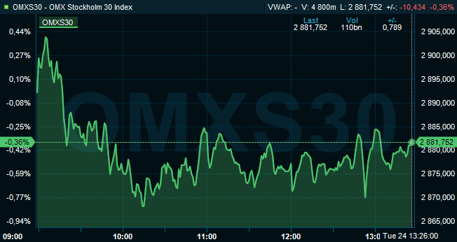 Efter måndagens svenska börsåterhämtning på 1 procent var det svenska storbolagsindexet OMXS30 vid 13.30-tiden på tisdagen ned 0,4 procent till nivån 2.882. Aktier för 7,2 miljarder kronor hade då bytt ägare på Stockholmsbörsen.