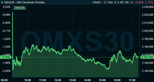 Vid börsens stängning hade storbolagsindexet OMXS30 fallit 1,7 procent till nivån 3.167. Aktier för 26 miljarder kronor hade då omsatts på Stockholmsbörsen i sin helhet.