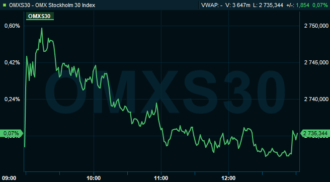 Omkring klockan 13 hade OMXS30 stigit 0,1 procent till 2.735 och aktier för 6,0 miljarder kronor var omsatta på Stockholmsbörsen.