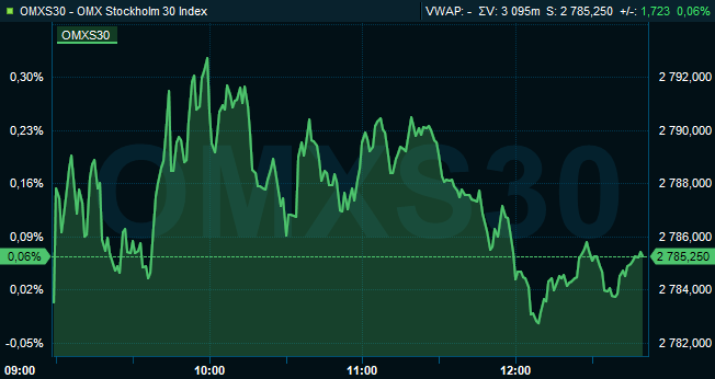 Omkring klockan 12.50 hade OMXS30 stigit 0,1 procent till 2.785. Aktier för omkring 5,1 miljarder kronor var då omsatta på Stockholmsbörsen i sin helhet.
