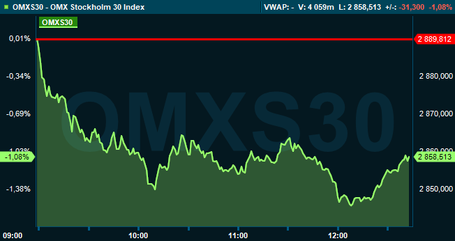 Klockan 12.45 var det svenska storbolagsindexet OMXS30 ned 1,1 procent till nivån 2.858. Då hade aktieaffärer för nära 6,4 miljarder kronor gjorts.